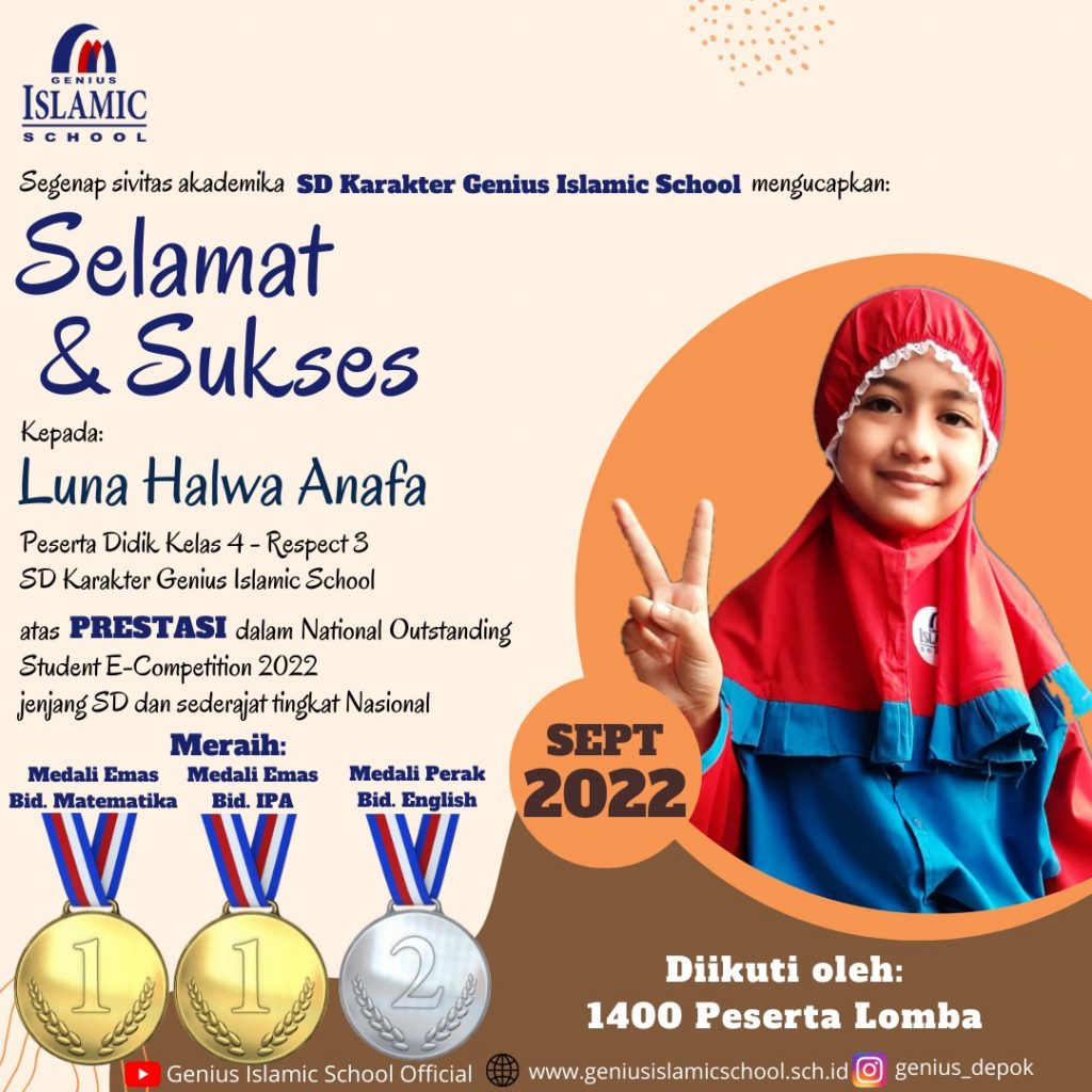 Pekan lalu, dalam ajang National Outstanding Student E-Competition 2022, Luna Halwa Anafa Siswi kelas 4 SD Karakter Genius Islamic School berhasil meraih 2 (dua) Medali Emas Tingkat Nasional bidang matematika dan IPA, sementara untuk bidang Bahasa Inggris ia meraih Medali Perak Tingkat Nasiona. Kompetisi tersebut diikuti oleh 1400 peserta dari berbagai provinsi di Indonesia.