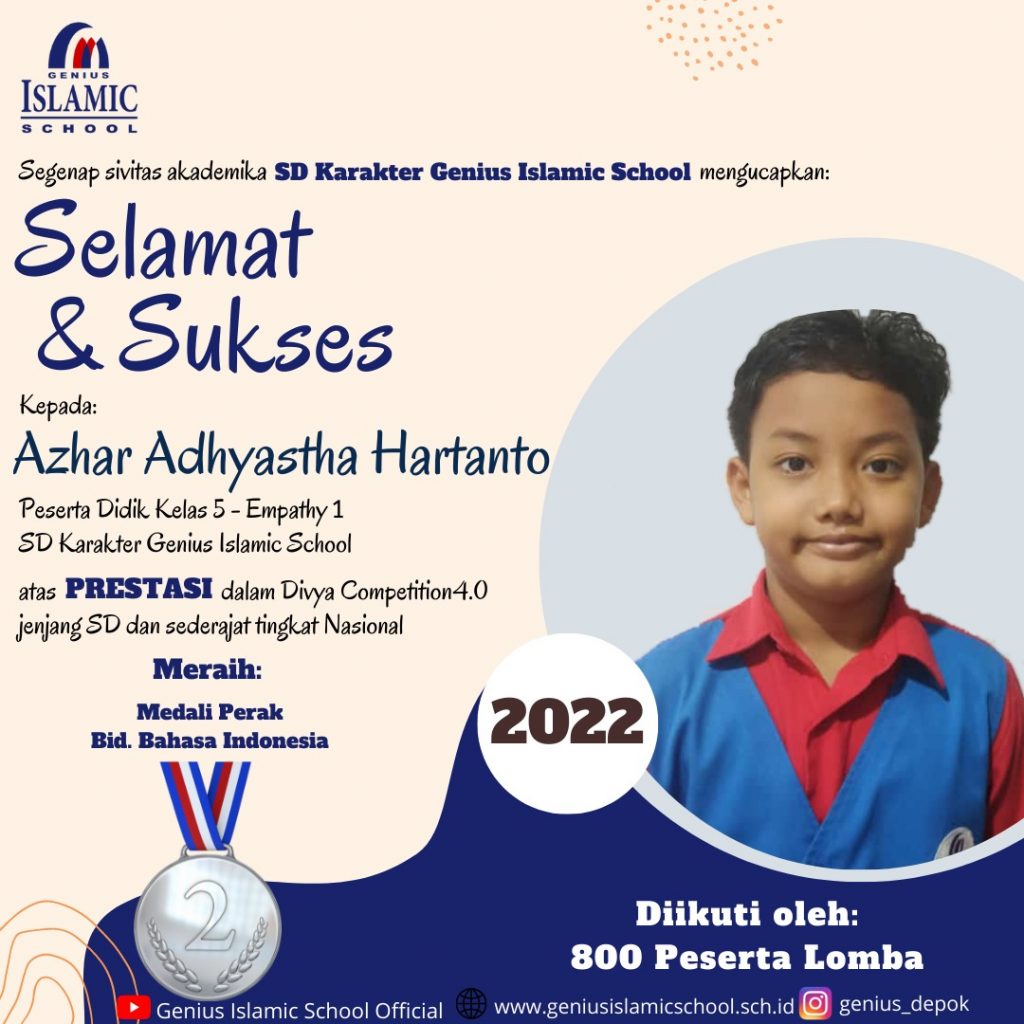 Sementara, prestasi lainnya diraih oleh Azhar Adhyastha Hartanto, Siswa Kelas 5 SD Karakter Genius Islamic School. Ia berhasil meraih Medali Perak Tingkat Nasional di bidang Bahasa Indonesia dalam ajang Divya Competition 4.0 Tingkat SD yang diikuti oleh 800 peserta lomba dari berbagai provinsi di Indonesia.